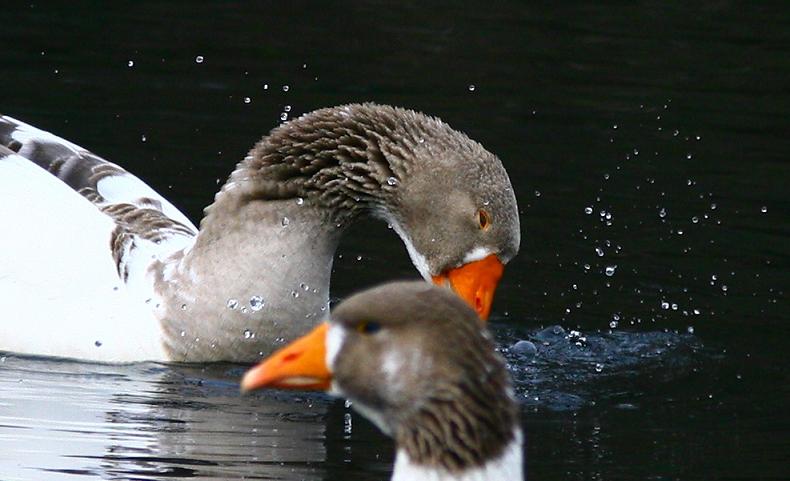 Buona l'intenzione, a parte la papera rompiballe che ti si è messa davanti sul più bello, giusto il tempo rapido che congela gli schizzi, troppo sovraesposta la parte bianca a dx: quell'area dell'immagine risulta illeggibile.