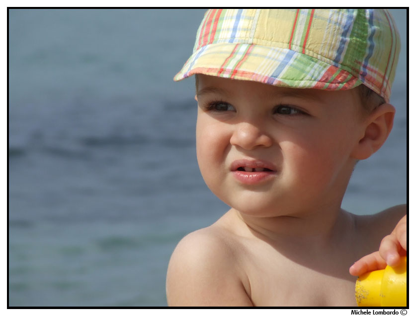 quindi da migliorare,manina che poteva anche star dentro la foto,eventuale colpo di flash,e occhietti in ombra(ma qui potevo farci ben poco...se gli toglievo il cappellino mi picchiava.. e poi avrebbe strizzato ancora di più gli occhi.. )