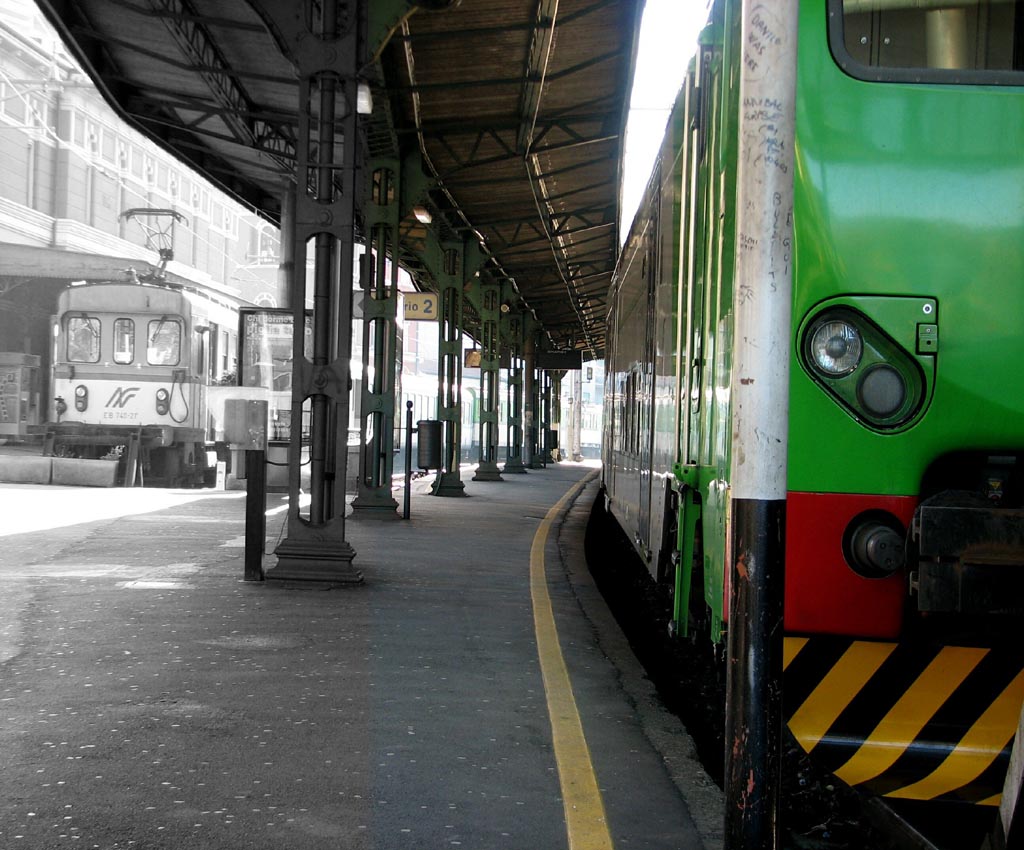 ..il treno in primo piano mi piace, la parte sx meno...inoltre la virata da colore a b/n è troppo netta, sul marciapiede si vede la divisione.