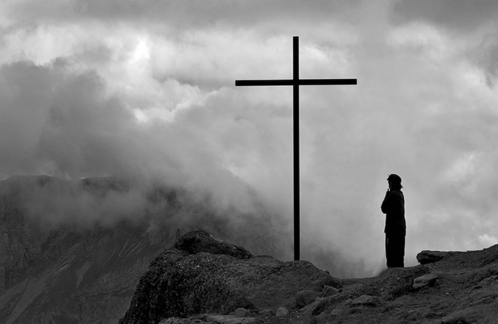 UnN'atmosfera austera, come lo sono le cime dei monti. Belle le due silhouette, della croce e della figura umana, a rafforzare questo senso di "eterno". Buona la conversione in b/n.