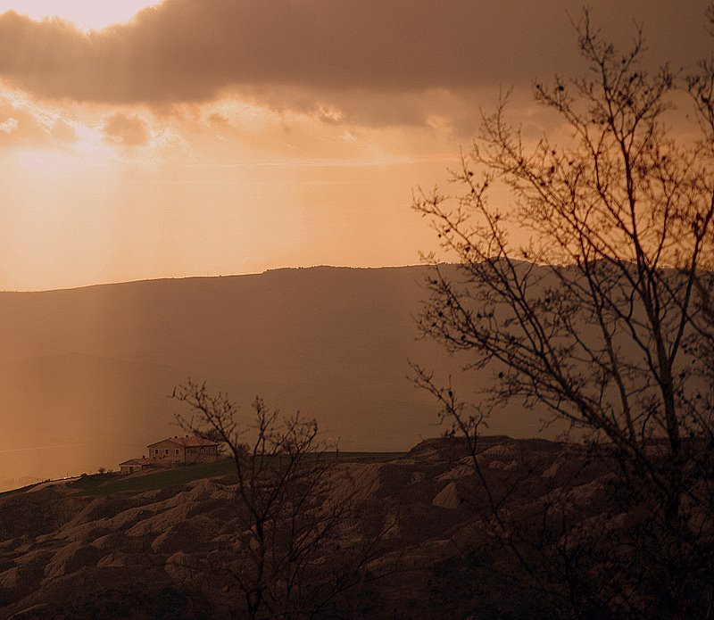 Intanto grazie per le critiche e i consigli. La mia intenzione era di riprendere la casetta sulla cresta del monte, con quella "biblica" lama di luce tra le nubi che il sole calante le aveva affiancato.Il mio punto di osservazione mi impediva di escludere gli alberi ....la cui presenza indesiderata ha alla fine reso la foto poco intellegibile. Ritenterò...munito di motosega.  |