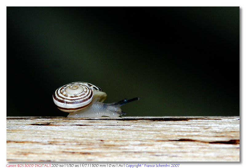 | Ciao Turkey. La tua foto mi piace. Il raggio di luce sembra voler indicare alla lumachina il passo sucessivo. Unica cosa... la vedo leggermente mossa. |