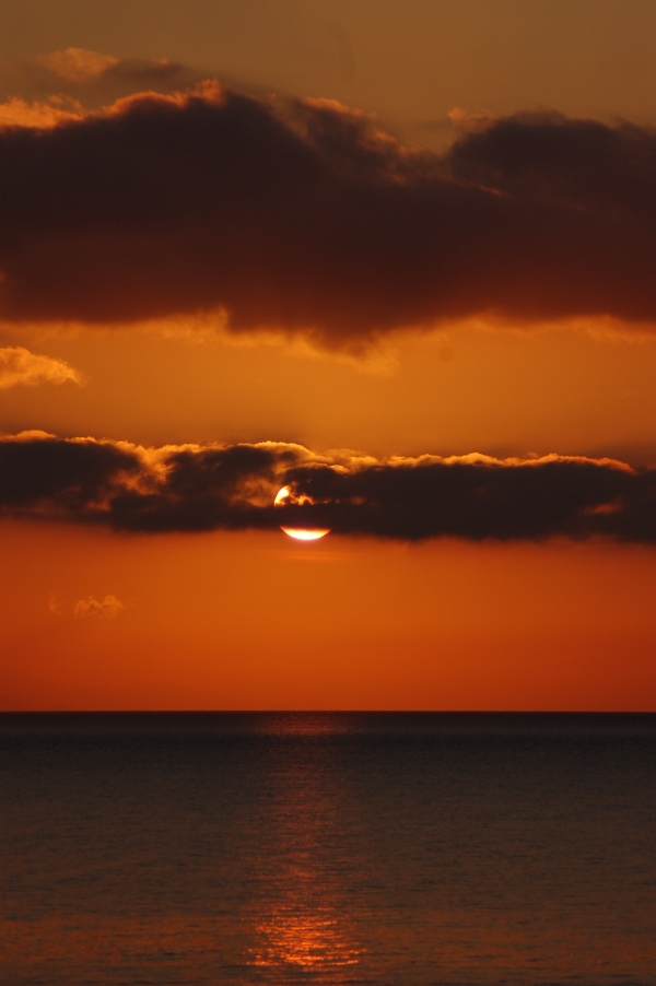 Bella! Hai catturato un ottimo "rosso di sera", con il sole timido, quasi nascosto dal primo strato di nubi, e con il secondo strato che fa da cornice naturale contrapponendosi al mare sottostante.  |