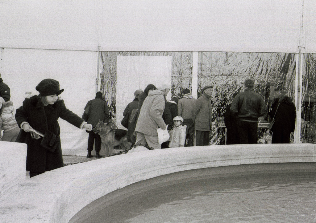La scena e' un po' confusa e nonostante la bambina in primo piano sembri essere il soggetto protagonista non vi sono le condizioni che riescono a staccare questo soggetto dal contesto. Complice anche una resa del bianco e nero che ha qualche problema nella resa dei bianchi, che hanno perso quasi totalmente struttura (notare ad es. la testa con i capelli bianchi di un signore che si 'impasta' con il telone dietro) e sono restituiti con un grigio poco verosimile, troppo omogeneo e granoso.