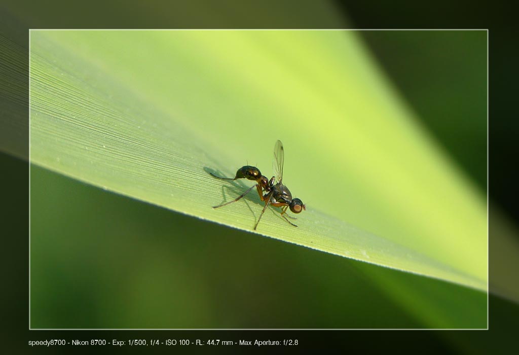 Lo scivolone verde movimenta bene il fotogramma con il moscerino che sembra quasi puntare i piedi per non scivolare