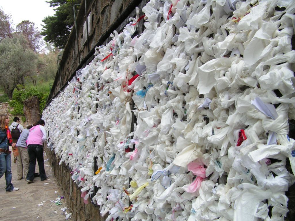 Le condizioni di illuminazione non sono per niente buone, direi pessime. Avrei sicuramente preferito una luce solare calda, come da tardo pomeriggio. Non mi piace anche la fetta di cielo completamente bianco che si vede tra gli alberi. Avrei valorizzato di più le persone che si accingono a lasciare messaggi. Ad esempio aspettando qualcuno da cogliere nel momento in cui lascia il suo fazzoletto. Buono però il punto di ripresa.