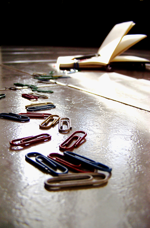 immagine piacevole anche se la luce non è eccezionale; troppo forte in alcune zone. Mi piace la composizione, con le graffette che formano una linea che guida l'occhio all'agenda sullo sfondo. Bella l'idea di tenerla aperta con una penna dentro, che fa pensare ad una rpesenza umana, ad una persona che si è momentaneamente assentata.