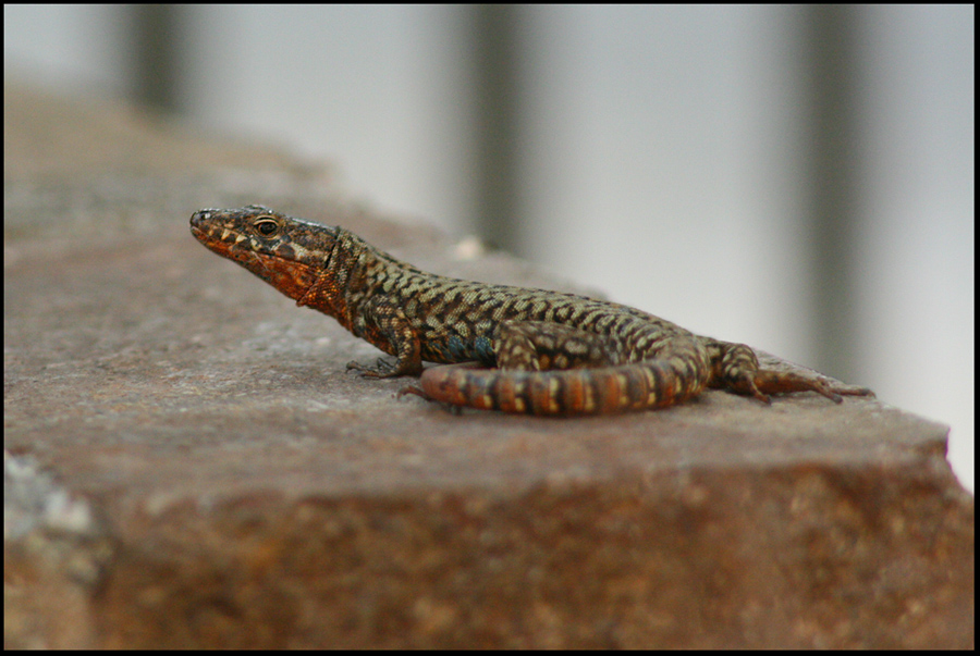 Lucertola colta di sorpresa su un muretto fuori casa.