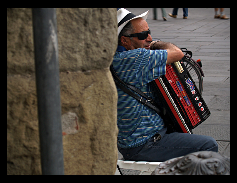 Le foto di scene di vita quotidiana mi piacciono molto il problema è che non sempre si riesce a fare una buona composizione perchè non se ne ha il tempo. In primo piano il palo a sinistra e quello in basso a destra distolgono molto l'attenzione dal soggetto. sul piano del soggetto la bici disturba un pochino. ti allego la mia composizione .