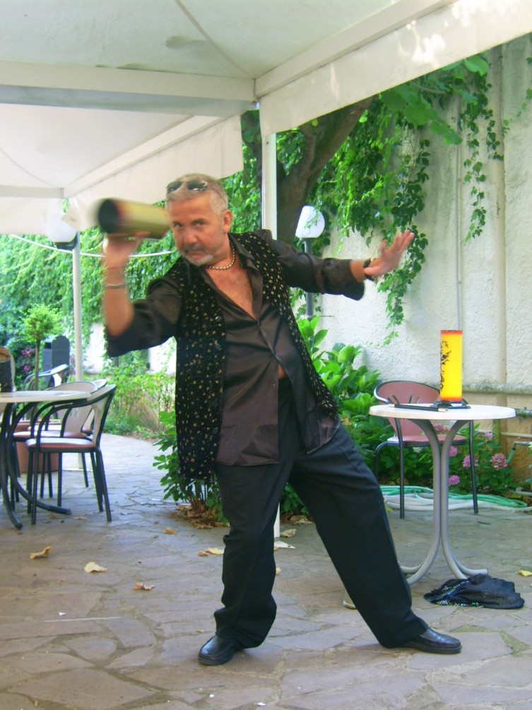 Sul tavolo la bacchetta magica... nera con le punte bianche.. in questa illusione il prestigiatore fa vedere l'interno del tubo che tiene in mano facendo notare che è vuoto... poi fa lo stesso con il porta tubo che è sul tavolo. Inserisce il primo dentro l'altro e.. voilà! Escono tantissimi foulard colorati Smile