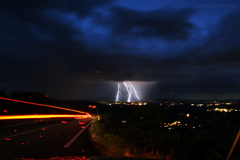 Grazie dei complimenti, ero vicino a Gubbio (Umbria) mi sono fermato lungo la strada che dava in una vallata ed ho provato a catturare lo spettacolo, ci sono riuscito con un po' di fortuna ma purtroppo non avuto la possibilità di comporre una scena perfetta visto che questi sono eventi casuali e difficili da catturare, e la macchina che passa durante lo scatto che crea quella scia, per me da un tocco di colore in uno sfondo scuro e privo di colori.