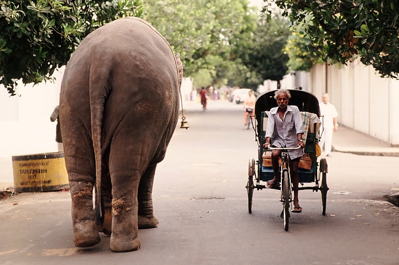 mi piace questo scatto per il contrasto tra il pachiderma e l'uomo esile, vedo le gambe possenti dell'elefante in contrasto con le fragili ruote da bicicletta . Questo è quello che mi ha colpito particolarmente.