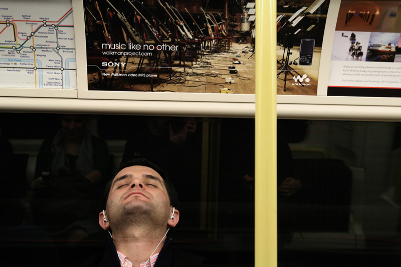 Ero seduto in metropolitana e avevo fatto caso al ragazzo che avevo di fronte, che era proprio sotto a quel cartello pubblicitario. Ad un certo punto si è appoggiato con la testa e ne ho subito approfittato per fargli la foto