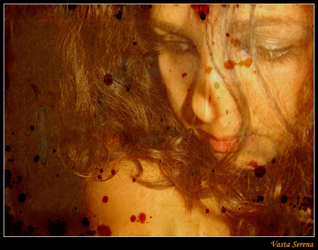 Sangue arterioso, fresco e ossigenato, sangue venoso, scuro e consumato, sangue fresco e rappreso che sembrano alternarsi fra strati di tessuto e di epidermide suggerendo un tempo indistinto e una goccia vermiglia che sembra cadere proprio sul labbra, sulla bocca chiusa di un viso pensoso e chino. Poi, per contrasto, una luce giallastra, quasi malata da pomeriggio morente, ad invadere tutta la scena... non la sento come una immagine serena, bensì sofferta anche fisicamente, ma non per questo meno bella. Ottima la resa nitidissima dell'oro dei capelli e perfetta la composizione con quell'accenno di spalla leggermente rivolta in avanti e quello spazio vuoto e denso sulla sinistra ad accompagnare la direzione solo ipotetica dello sguardo negato.