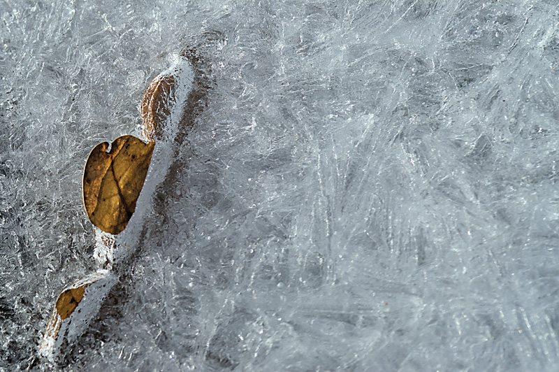 Tu pensa, apparentemente le tre folglie sembrano perdenti strette cos' come sono nella morsa del ghiaccio e invece comunque restano vincenti per altro verso in quanto sono loro che dettano la forma alla concrezione del ghiaccio intorno.