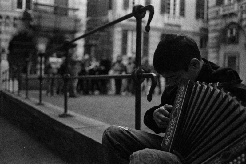 la foto è una scansione da pellicola, il negativo è molto pi' neutro, conto di aprire un pelo le ombre sul viso e sulla fisarmonica