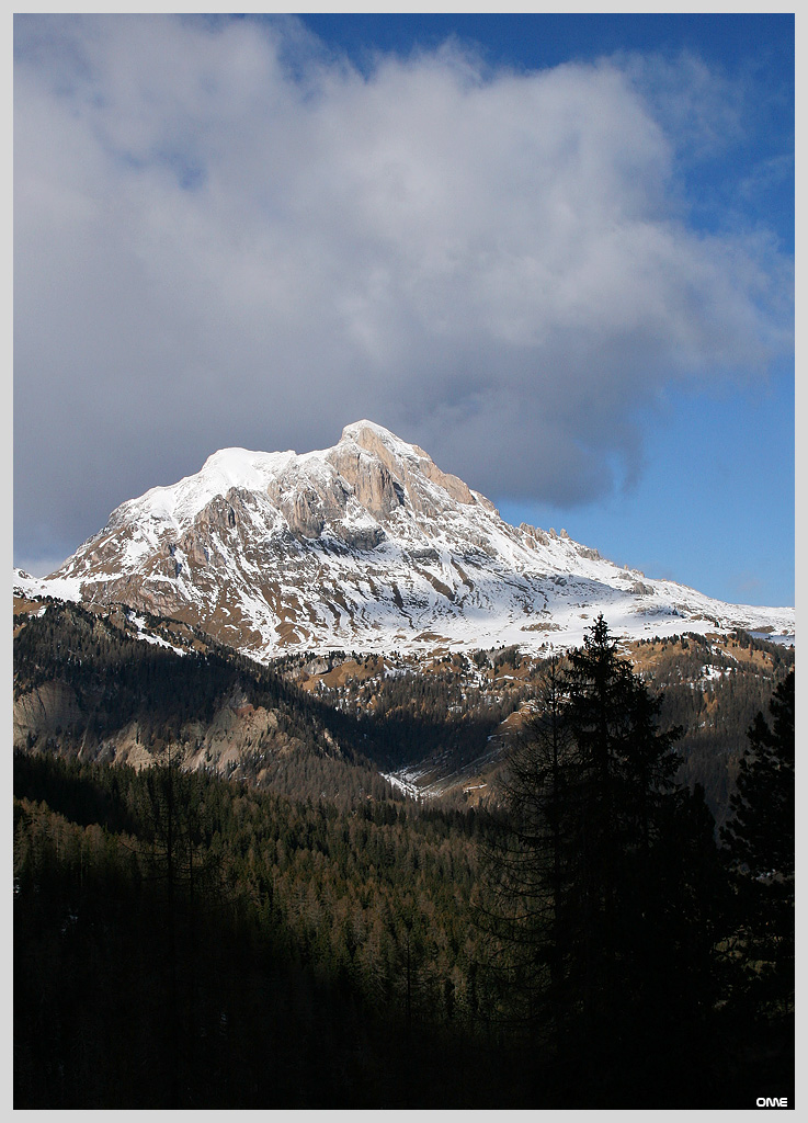 Mi è più familiare la vista dal Puez. Grazie per avermelo fatto vedere da un'altro versante. Mentre il bosco sottostante dona profondità all'immagine trovo la parte del cielo troppo grande. Un filo di maschera di contrasto avrebbe giovato alla definizione.