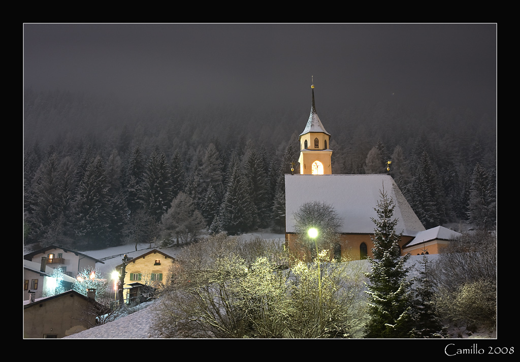 ti hanno gia' detto altri, io ti dico solo che mi piace molto come quel campanile pare emergere in 3D dalla foto, dallo sfondo di bellissimi alberi innevati leggermente, e le luci conferiscono al tutto un'atmosfera classica da 'natale'. anche il lampione sul davanti che rompe un po', ha la sua funzione, getta luce sugli alberi in primo piano contribuendo a ravvivare il panorama, come se avessi usato il flash. una cosa sola mi 'turba'... la chiesa sembra essere segata via, come se un gigante l'avesse tagliata col coltello per mangiarne un pezzo!