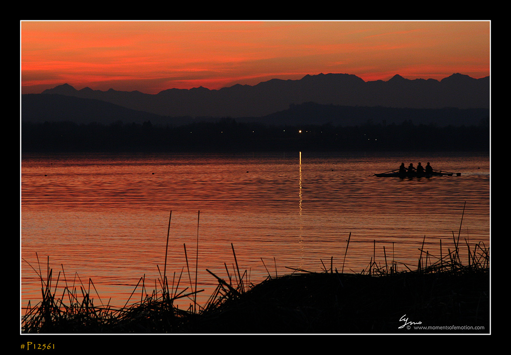 Immagine veramente molto bella, col rosso del crepuscolo che dal cielo si diffonde sull'acqua, la riva nera in primo piano in una nitidissima silhouette, le sagome dei monti e quelle dei rematori, il faro... Tutto molto valido. Complimenti.