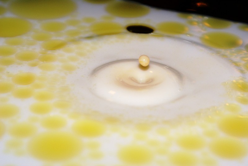 eccovi una goccia di latte che sta per immergersi in un misto di di olio e latte