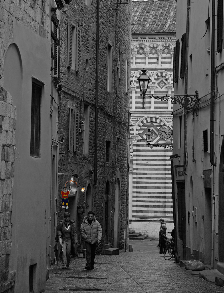 Avevo preso in considerazione l'ipotesi di un b/n totale, poi facendo la prova, ho giudicato che quella porzione colorata enfatizzava la presenza della coppia assorta e pensierosa che camminava nella stradina rendendo, a mio parere, più efficace l'immagine.