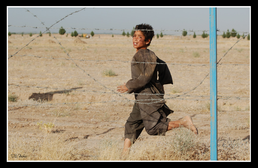 Uno scatto bellissimo. Una recinzione, un bambino che corre con lo sguardo pieno di sofferenza, il tutto con un'ottima composizione.