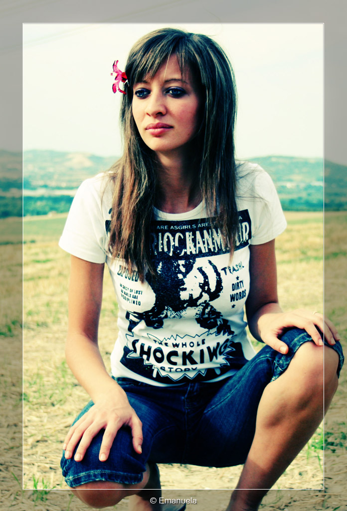 | Sempre interessanti le tonalità acide, ci sta bene anche l'abbigliamento, in particolare la t-shirt (invece il fiore tra i capelli, boh, non lo vedo molto bene in quella posizione)... come composizione non è male, ma come inquadratura, forse avrei cercato di includere interamente il soggetto (non è canonicamente bello vedere i tagli della caviglia sinistra -a destra nello scatto- e del sandalo a bordo foto). Lo sguardo perso e l'espressione spenta non mi dicono molto in realtà, ma fanno parte evidentemente dell'intento fotografico, sono dettagli personali e non espressamente discutibili... avrei cercato di utilizzare un pannello di schiarita sulla destra, in modo da evitare l'ombra portata dalla gamba più in basso verso quella più in alto, il braccio in ombra (quello più vicino al torace), ed in parte il viso. Ultimo ma non ultimo, avrei cancellato i cavi di alta tensione che si intravedono in alto a sinistra dello scatto. Buono il passepartout (anche se il riquadro bianco da 1 pixel non è esattamente coincidente con l'interno della fascia semi-trasparente), ma personalmente lo preferisco nero, dona sicuramente più profondità allo scatto. Nell'insieme, non leggo chissà quanta nitidezza (anche se per dire ciò avrei voluto vedere lo scatto originale, è poco discutibile con questa postproduzione), ma con pochi accorgimenti sono convinto che alla prossima saprai fare molto meglio....