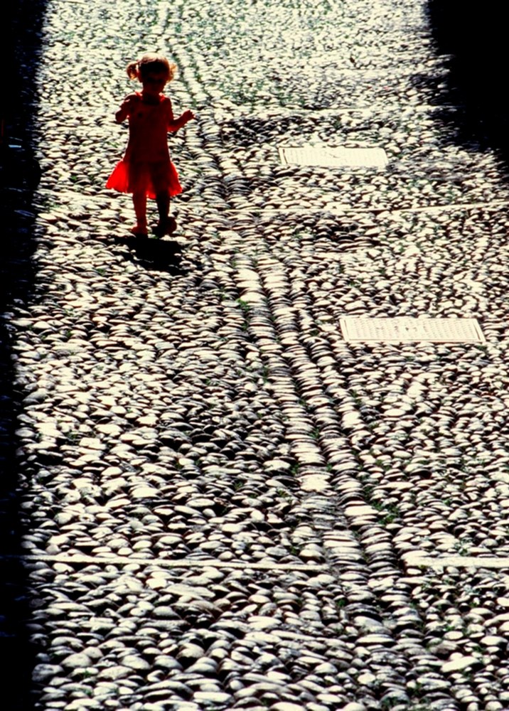 Pierangelo, a me piace moltissimo questa immagine, ben composta con lo sguardo che segue la strada fino alla bimbetta, la quale col sou vestitino da una notevole macchia di colore sul grigio della strada, bravo.