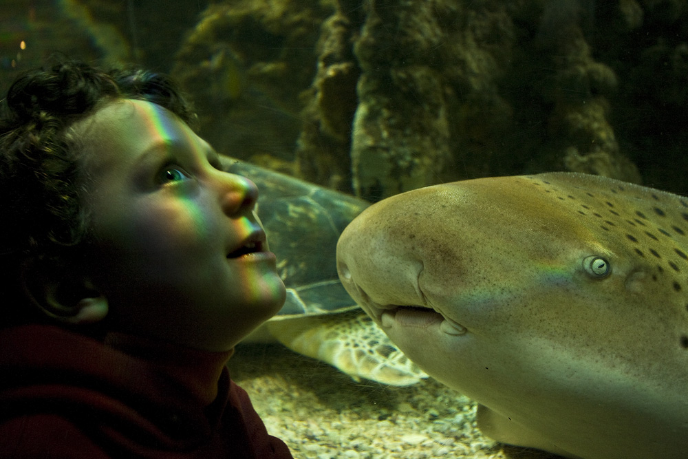 bellissima questa foto, lo sgardo sognante del bambino ed il pesce che lo guarda incuriosito. Sembra che i ruoli siano invertiti, il pesce diventa lo spettatore ed il bambino lo spettacolo Ottimo il rifllesso di lice che forma un piccolo arcobaleno sul viso del bambino.