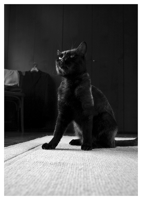 Questa volta il “piede” del fotogramma è chiaro, ma lo scatto o meglio l’architettura chiaroscurale regge benissimo e l’ampia porzione di tappeto chiaro in basso crea il necessario contrappunto allo sfondo grigio scuro per meglio ....”sollevare” e dare un senso quasi di levità alla figura del ...”padrone di casa”.