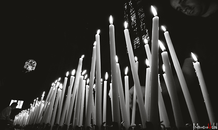 Mi piace molto la prospettiva molto accentuata, il forte contrasto ta le candele, fonte di luce, e lo sfondo buio, misterioso.