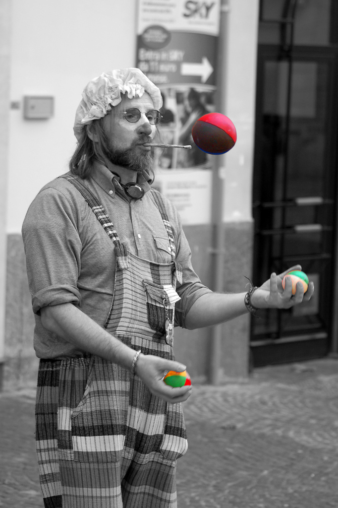Secondo me la scelta del bianco nero però ha forse penalizzato la resa di quell’esuberanza che nel nostro immaginario rievoca la performance di un artista da strada, un pò clown, un pò giocoliere: forse proprio nel colore (ma è solo un’ipotesi personale) si celava già la strada di una parte del racconto di questo scatto. Non condivido in questa senso la scelta della desaturazione parziale che se da un lato vuole concentrare l’attenzione sulle sfere e quindi sulla gestualità dell’artista ....dall’altro lato “spegne” un pò il resto della compagine figurativa, relegandola in secondo piano.