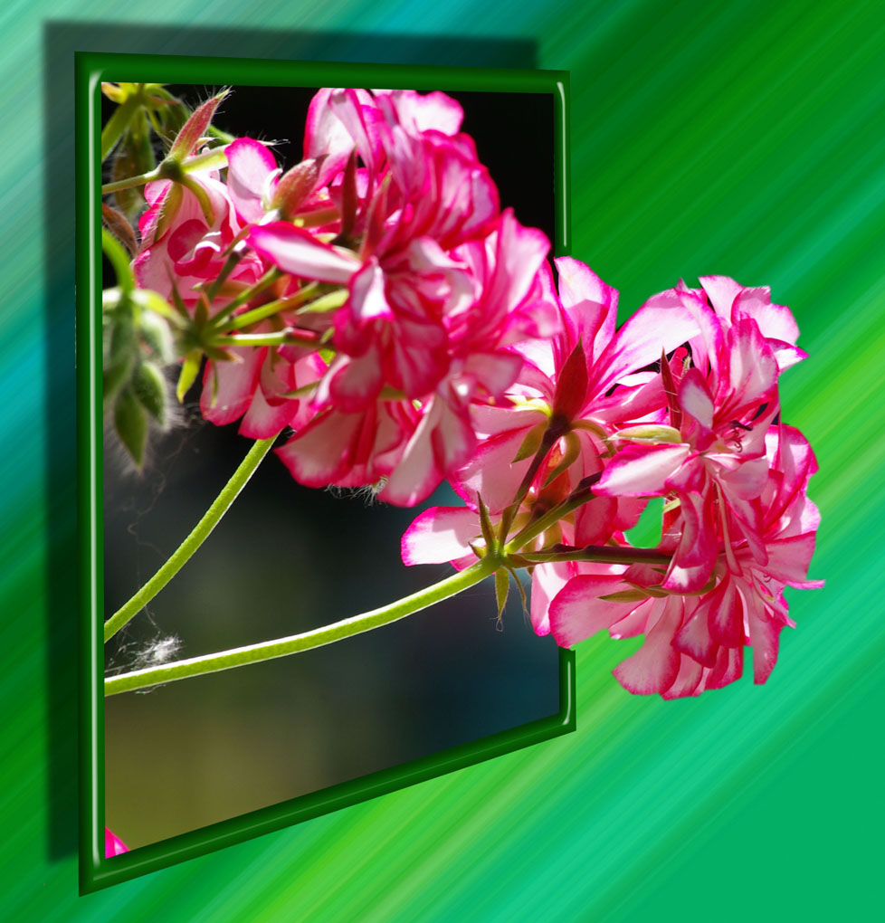 Poi, ammettiamo che la foto di base sia una buona foto di partenza per questo lavoro, devi fare molta attenzione a scontornare il soggetto (vedi che il fiore ha dei contorni abbastanza duri) e ad eliminare ogni piccola parte del vecchio sfondo (nel geranio che esce, in alto a destra è ancora visibile lo sfondo scuro mentre il tuo è verde).