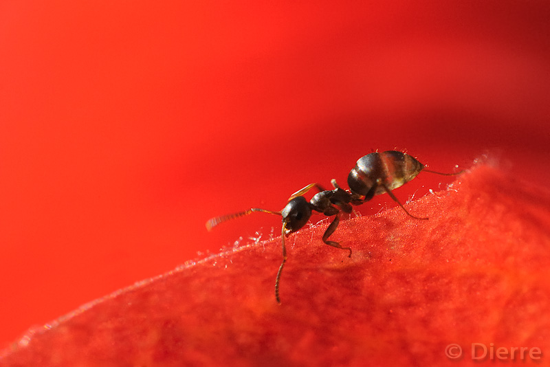 Il tempo è di 1/400", ma le formiche sono rapidissime e con quell'ingrandimento sarebbe statonecessario un tempo più veloce .. Ci satava anche un diaframma più chiuso ... La messa a fuoco è stata fatta praticamente alla cieca, sperando che una formica entrasse in campo nel posto giusto ... Per migliorarla sarebbero servite altre prove che purtroppo non ho avuto modo di fare ...