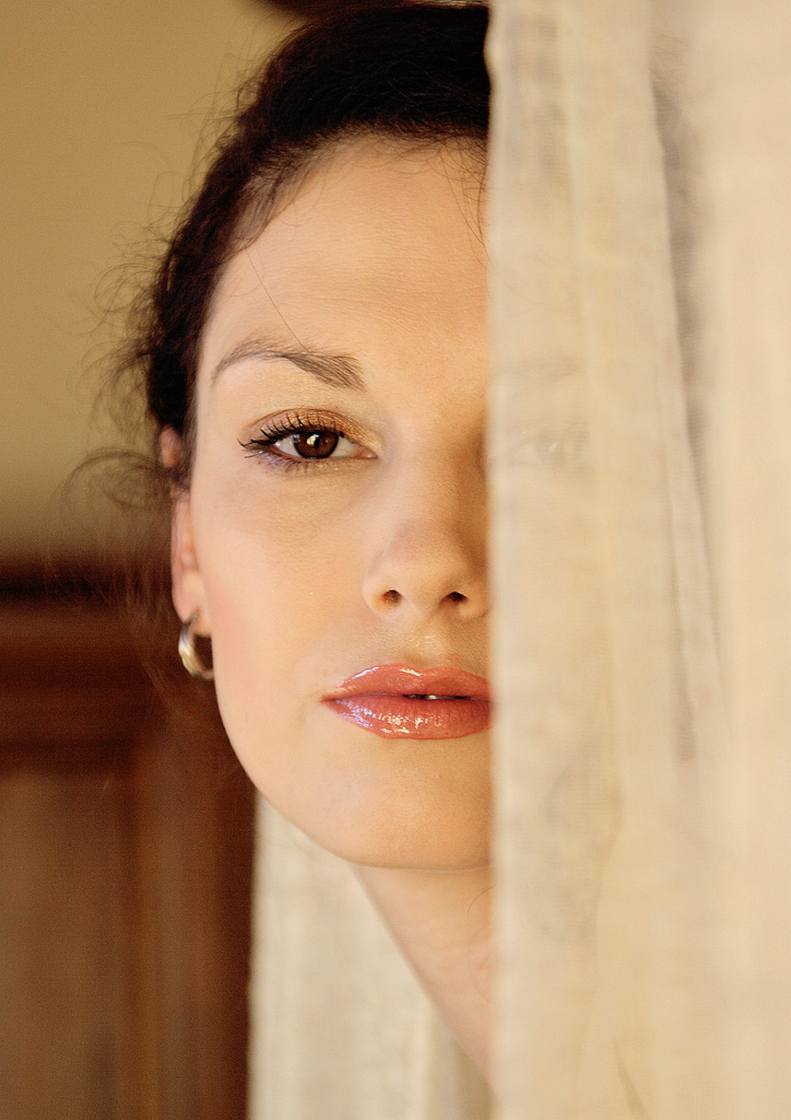 Che dire.. l'idea e' interessante, creare una classica meta' usando un drappo, pero' ci sono un po di cose che non mi permettono di apprezzare appieno lo scatto appieno. Una cosa e' che la foto sembra e sottolineo sembra (non posso valutare se e' cosi realmente) soffrire di un leggero micromosso che toglie qualcosa non tanto alle labbra bellissima quanto agli occhi. Altra cosa l'eliminazione dei capelli in piu' avrebbe ordinato un po la scena e giovato all'immagine, in ultima istanza avrei stretto leggermente inquadratura per focalizzare maggiormente l'attenzione sul viso (gia' il mancato parallelismo tra il drappo e la porta sulle spalle distrae un po).