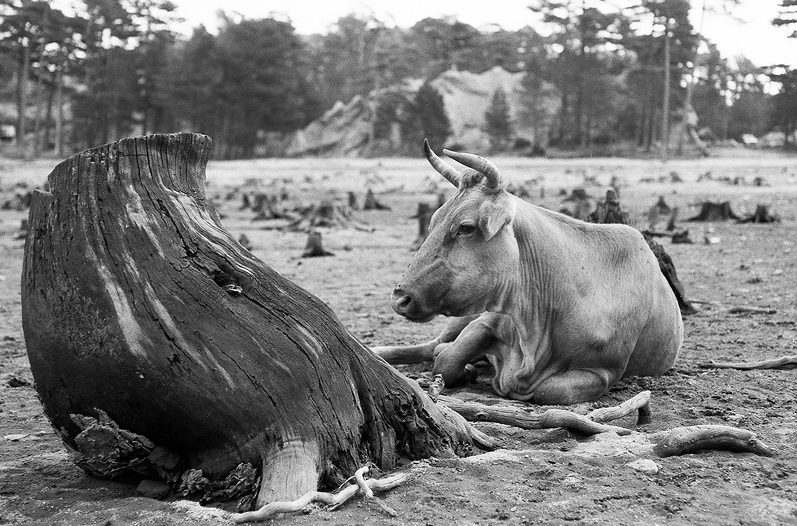 Colpiscono anche me gli echi di forme che si rincorrono dal tronco, alla pelle della mucca, fino al rilievo sfuocato sullo sfondo.