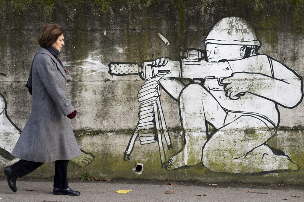 Mi piace l'espressione decisa con cui il passante affronta il soldato armato