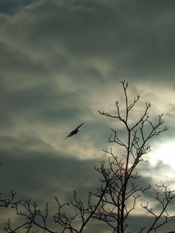 Ti dico subito che la foto non è stata postlavorata ma è proprio naturale, infatti mi ha colpito proprio il cielo, mentre l'uccello si è infilato mentre scattavo. Quella macchia rossastra sul ramo, è il riflesso del sole, ma adesso che me l'hai fatta notare, in effetti disturba.