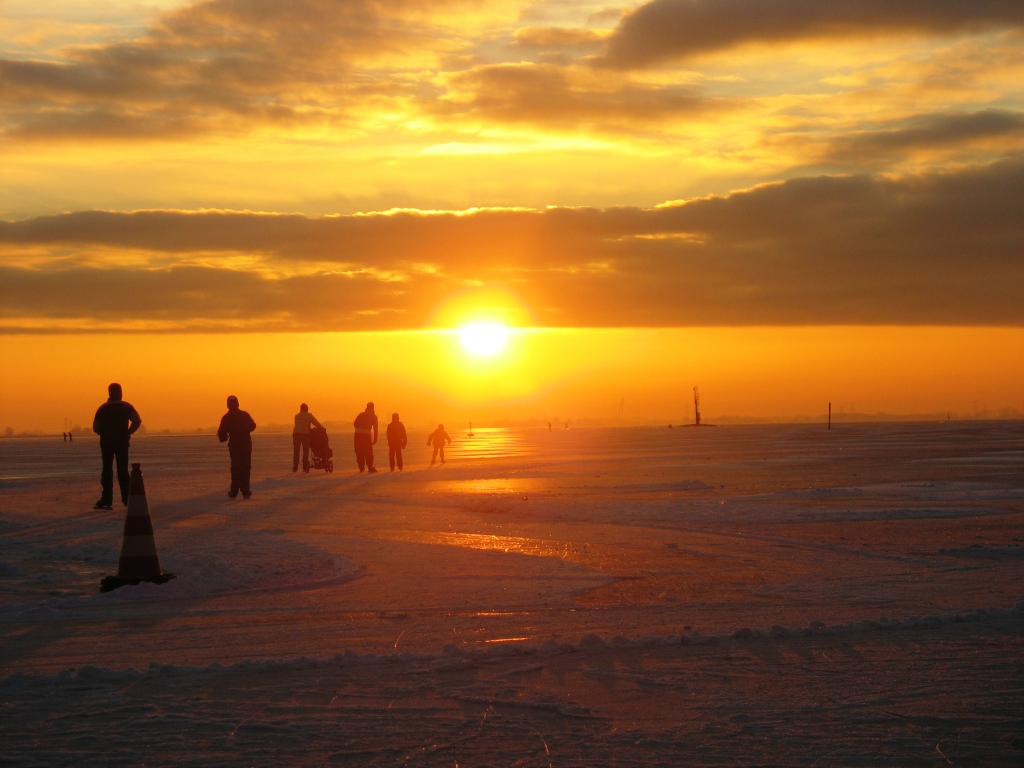 toglierei un pò di cielo,bella la contrapposizione del tramonto con tonalità calde e i pattinatori sul ghiaccio Ok!