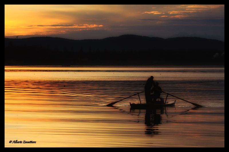 Un tramonto reso molto interessate dalle figure umane sulla barca in primo piano.