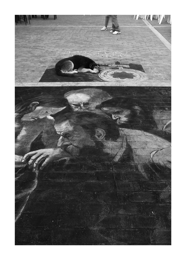 Penso che la posa del cane dia quel fattore street che discrimina da una foto di un disegno di un madonnaro. Già di suo riprende la forma di una volta cranica dalla folta capigliatura come quella dei personaggi sottostanti; la zampina rilassata pare ricordare la mano che afferra quella di San Tommaso che scruta il costato del Cristo. Inoltre il punto di ripresa insieme alla scelta del B/N schiaccia quel cane, facendone perdere di tridimesionalità, proprio come se fosse anch'esso un disegno sulla paventazione.