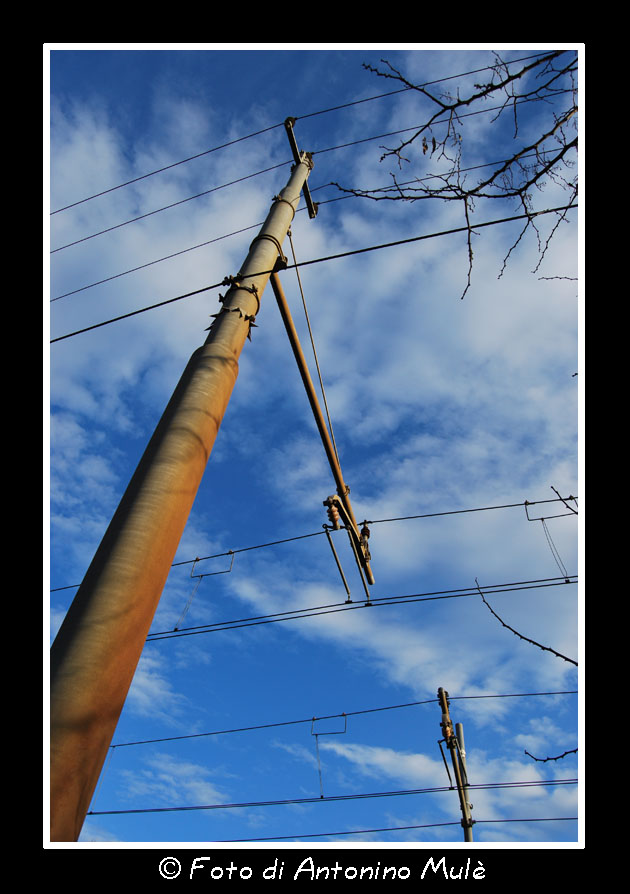 I pali dell'alta tensione ferroviaria sulla Firenze-Roma in un pomeriggio di Gennaio