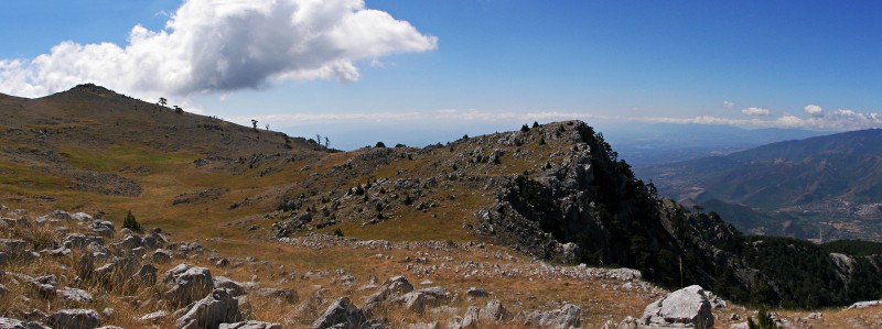 Questa è l'anticima del monte Pollino, intorno ai 2100m di quota, e quello in basso a destra è uno dei boschi di pino loricato più fitti di tutto il gruppo montuoso, mentre la cima a destra dovrebbe essere il Pollinello.
