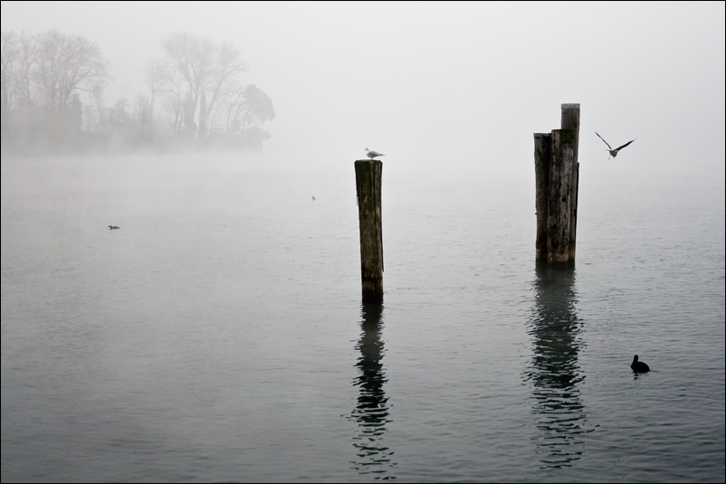 Qui mi pare che la foto sia costruita, sotto l'aspetto prima detto, con una certa valenza pittorica. La ripartizione dei pochi soggetti, nel teatro paesaggistcio favorito dalla presenza edificante della nebbia, è molto ideale e anche l'uccello che spicca il volo a mio parere rappresenta uno dei punti a favore della buona riuscita dell'immagine. Il senso dell'attimo colto, della vitalità del luogo, che sospeso nella nebbia sembrerebbe quasi altrimenti inanimato, è riscattato proprio da quell'uccello che spicca il volo con grazia di ali e aggiunge un gradiente di poesia all'immagine.