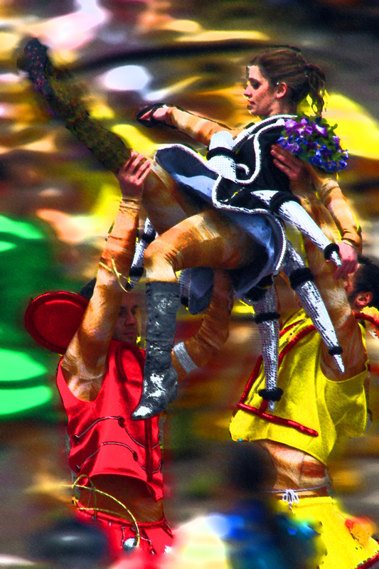 L'effetto da' bene la sensazione della molteplicità dei colori e dalla vita cromatica della scena.. ma si vede un po' troppo marcato, in alcuni punti, l'azione di scontorno dei soggetti, come in alto sulla ragazza e in basso, con l'uomo sulla destra, che copre parte dell'uomo a destra.. perché non rendere più 'fumettistico' il tutto, portando anche il volto dell'uomo sulla sinistra a diventare come quello della ragazza? mi sembra, ora, un po' troppo definito..