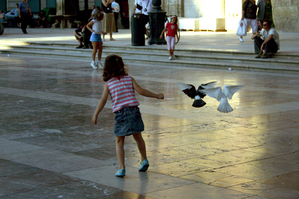 Però è molto gradevole il momento colto con i due piccioni in sincronìa rincorsi dalla bambina. |