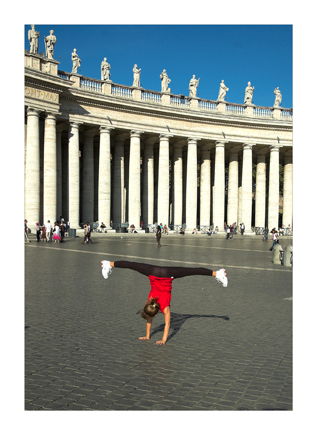 C'è l'attimo in cui immortali la ragazza: inusuale la location, una delle sedi principali dlela cristianità, per fare un pò di ginnastica artistica. Ottimo il punto di ripresa: sembra che la ragazza voglia misurare con l'estensione degli arti inferiori la lunghezza della banda sovrastante che attraversa la piazza.