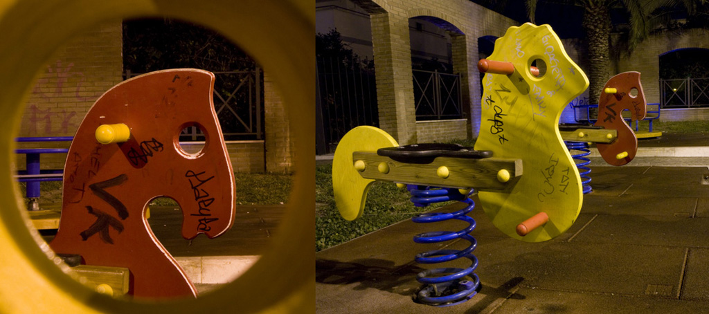 visualizza l'uomo dalla parte del foro e i ricordi di un bambino nella visuale del cavallino, la realizzazione e' stata interotta da alcuni ragazzi che nella notte si sono accostati con la macchina e' mi hanno minacciato. e da li ho capito che non solo chi fotografa per professione e' a rischio ma anche noi amatori. infatti non sono riuscito a fare piu' di 2 scatti attraverso il foro essendo esposizioni di circa 45 secondi l'una, portando a casa questo risultato, ma avrei preferito includere una porzione minore sopra la testa del cavallino. cmq ho postato sia l'idea che come e' stata realizzata... purtroppo di queste sperimentazioni e' pieno l'harddisk e l'ideea mi era piaciuta. se hai dei consigli compositivi o narrativi sono ben accetti....