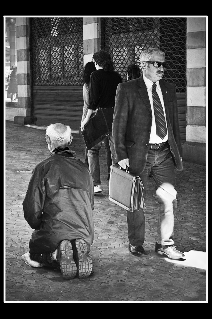 scatto ben riuscito... a mio avviso mette in mostra l'indifferenza dell'uomo con la 24 ore e gli occhiali nei confronti del mendicante..