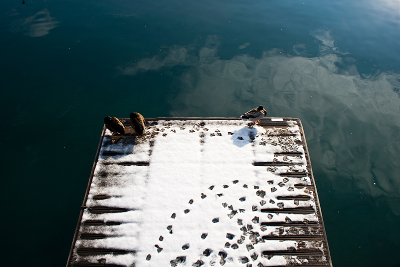 Orme sulla neve che quasi indicano la perplessità delle anatre a tufafrsi, mi piace molto l'angolazione di ripresa ed il colore dell'acqua.